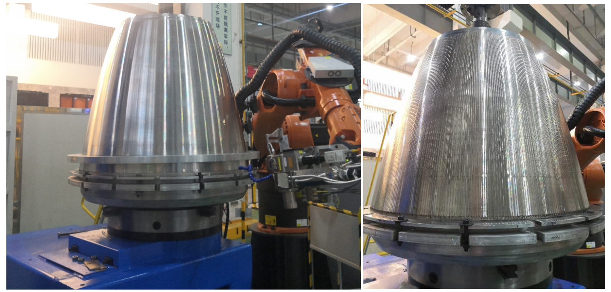 2.設備精度高。火箭噴管尾筒焊縫密集,且均為疊焊焊縫,一旦將夾層外壁套上開始焊接將不可再目測描點,如果設備精度不夠將導致焊接失敗。噴管夾層在360度范圍內均布近750條長度1.5m的焊縫,焊縫寬度1.1mm±0.3mm,每道焊縫周向偏差0.15mm以內。這相當于在一條總長超過1KM但寬度僅有1.1mm的道路上蒙著眼睛向前跑,任何一點軌跡偏差超過0.15mm產品就會將夾層焊漏導致產品報廢。