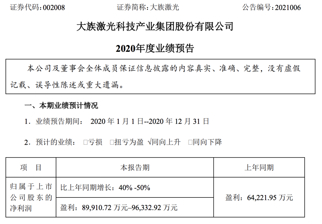 日前,大族激光發布公告,預計2020年歸屬于上市公司股東的凈利潤8.99–9.63億元,比上年同期增長40%-50%。