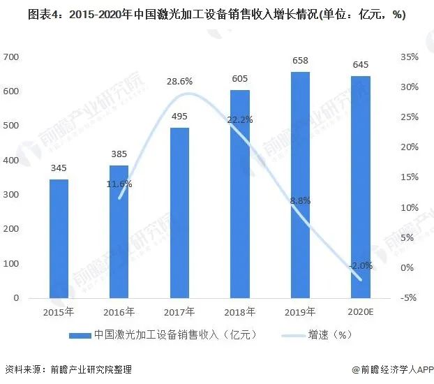 中國激光加工設備銷售收入約為全球的一半,2015-2020年中國激光加工設備銷售收入持續(xù)增長,2019年達658億元,2020年初步估計達到645億元。
