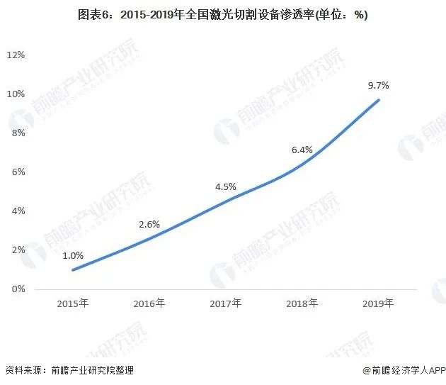 相對于國際激光設備制造與應用,我國激光切割設備滲透率較低,歐美發(fā)達國家已經步入“光加工”時代,我國激光加工設備應用滲透率相對國際水平較低,2019年我國激光切割設備銷量僅為金屬削機床銷量的9.7%,不到10%,占比較低。
