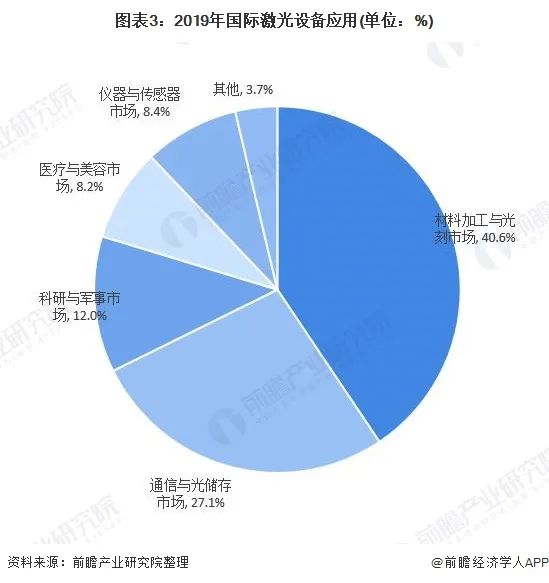 國際激光設備應用較為多元化,包括材料加工與光刻市場、通信與光儲存市場、科研與軍事市場、醫(yī)療與美容市場、儀器與傳感器市場等,其中,材料加工與光刻市場占比最高,達40.6%;其次為通信與光儲存市場,占比為27.1%。