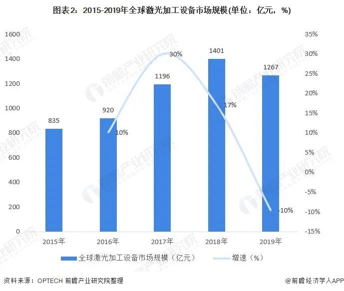 全球激光加工設備市場規(guī)模超過千億元,2019年達到1267億元,同比下降10%。
