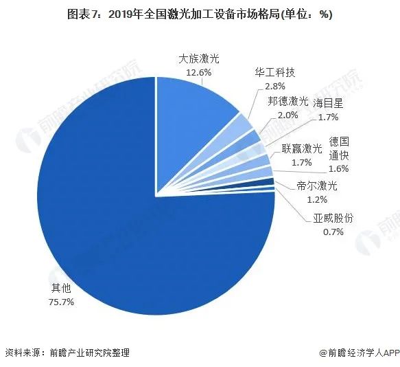 全國激光加工設備市場格局較為分散,全國激光加工設備TOP8占比僅為24.3%,市場集中度較低,排名首位的大族激光市占率也僅為12.6%,但是高于占比排名第二位的華工科技(占有率僅為2.8%)約10個百分比,呈現斷崖式領先。