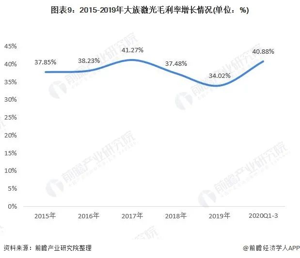 2015-2019年大族激光毛利率整體在35%以上水平,2019年略有下降,主要是受產品銷售結構及市場競爭加劇的影響,導致公司綜合毛利率較2018年度下降約3.46個百分點;但是2020年前三季度上升為40.88%。