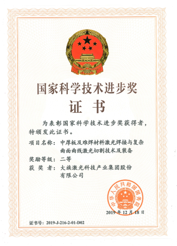 2019年,大族激光智能裝備集團“中厚板及難焊材料激光焊接與復雜曲面曲線激光切割技術及裝備”項目榮獲科技界最高獎“國家科學技術進步獎”;代表國際領先水平的三維五軸激光加工裝備獲得“中國好設計獎”。