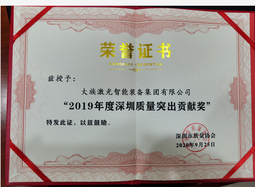 峰會期間,大族激光智能裝備集團被授予“深圳質量引領先進示范單位”、“2019年度深圳質量突出貢獻獎”,以表彰其在深圳先行示范區的高質量發展進程中發揮的優秀企業示范作用與顯著貢獻。