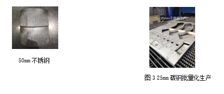 近幾年,激光切割的市場需求不斷加大,人們對于其加工能力的期待也越來越高,這種期待不僅僅是對能夠切,還必須保證切得好和切得快。針對25mm以上厚度的碳鋼板,為了獲得良好的切割效果,大族激光智能裝備集團以厚板穿孔、切割面質量及整板加工等關鍵技術難點作為主攻方向,隨著萬瓦級功率切割技術不斷成熟且越多的被用于實際金屬板材加工中,積累了豐富的應用經(jīng)驗,并逐漸掌握了厚板高品質切割工藝。當前25mm以上厚度碳鋼已實現(xiàn)批量穩(wěn)定生產,25mm碳鋼切割速度達1.2m/min。