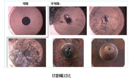 通常,噴嘴對切割的影響主要體現(xiàn)在噴嘴不圓造成光束與氣流同軸度不佳,造成切割斷面不一致甚至無法切割,割嘴表面因碰撞或熔漬粘連造成表面凹凸不平,影響隨動和切割效果。噴嘴孔徑的大小對切割質量、穿孔質量有絕對性的影響,噴嘴孔徑越大,對保護鏡的保護能力就越差,切割時熔化物的火花飛濺,往上彈的幾率很大,使得鏡片的壽命縮短。