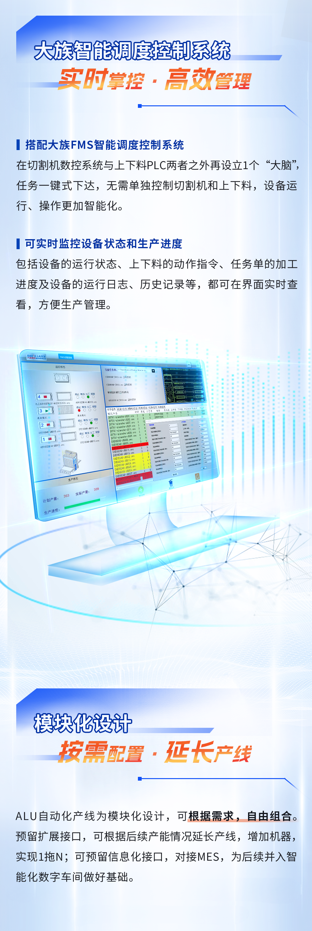 全新結構的ALU系列自動化切割生產線,協調性更高、效率更高,模塊化設計,可根據需求自由組合,預留擴展接口,可根據后續實際產能情況增加機器,實現1拖N,并可預留信息化接口,對接MES,為后續并入智能化數字車間做好基礎。